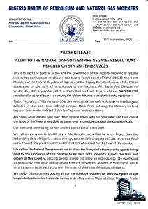 The statement read, “This is to alert the general public and government of the Federal Republic of Nigeria thag notwithstanding the resolution reached and signed at the office of the DSS with three Ministers of the Federal Republic of Nigeria and the Deputy Director General of the DSS in attendance on the right of unionization of the Workers, Alh Sayyu Aliu Dantata on Wednesday, 10th September, 2025 instructed all his Truck Drivers who are NUPENG-PTD members for several years to remove the Union Stickers from their trucks yesterday.