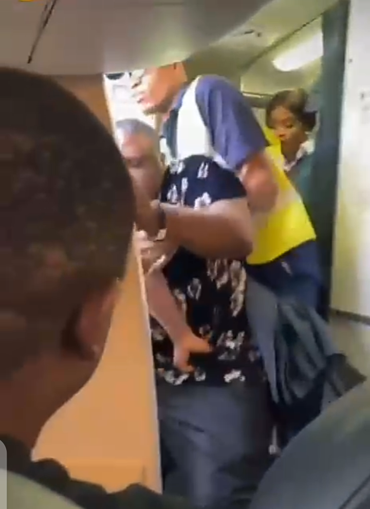 A video circulating on social media shows airline officials dragging a male passenger off the aircraft, while background voices can be heard saying, “Yes, yes, go down,” suggesting that some bystanders supported the action.